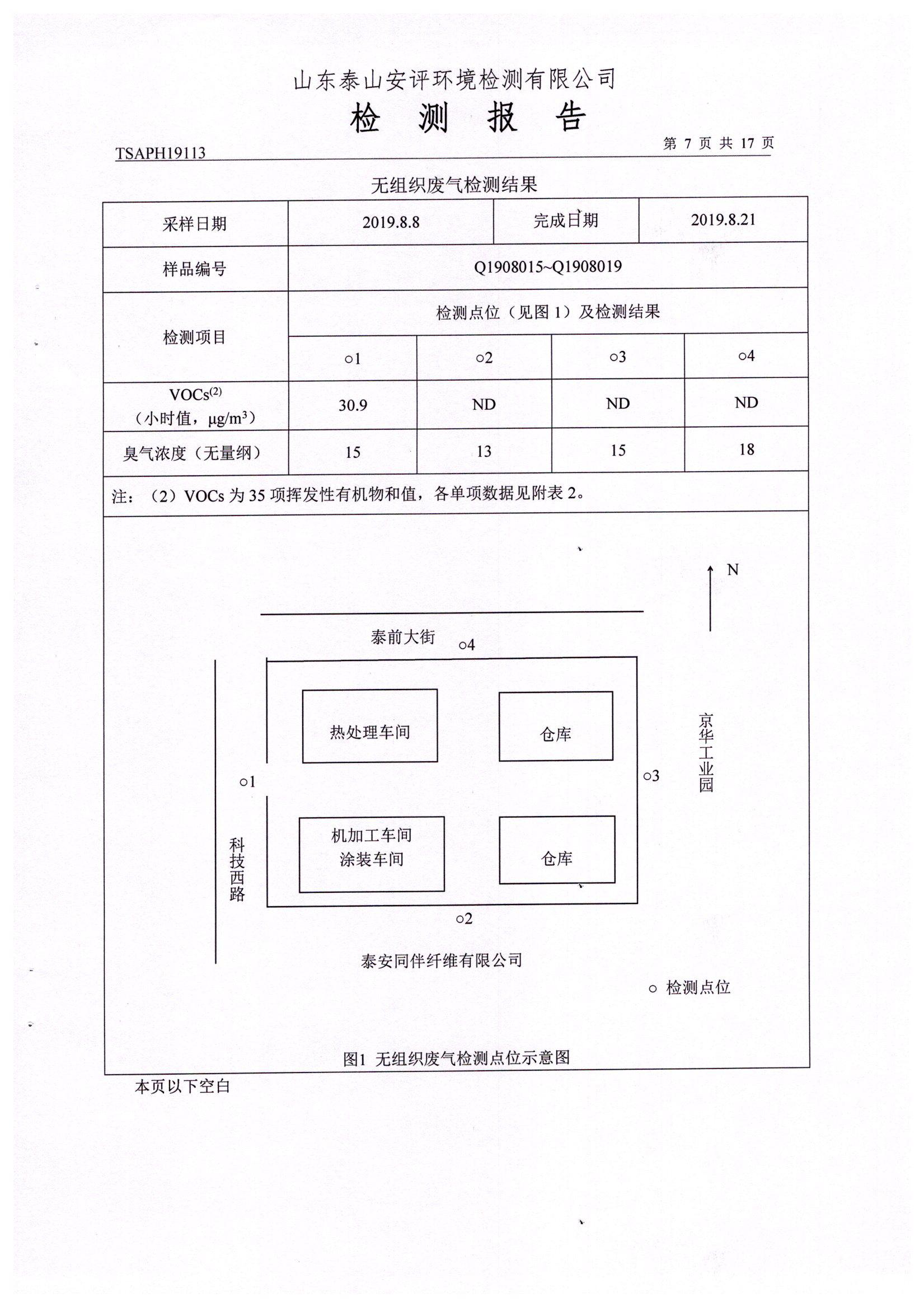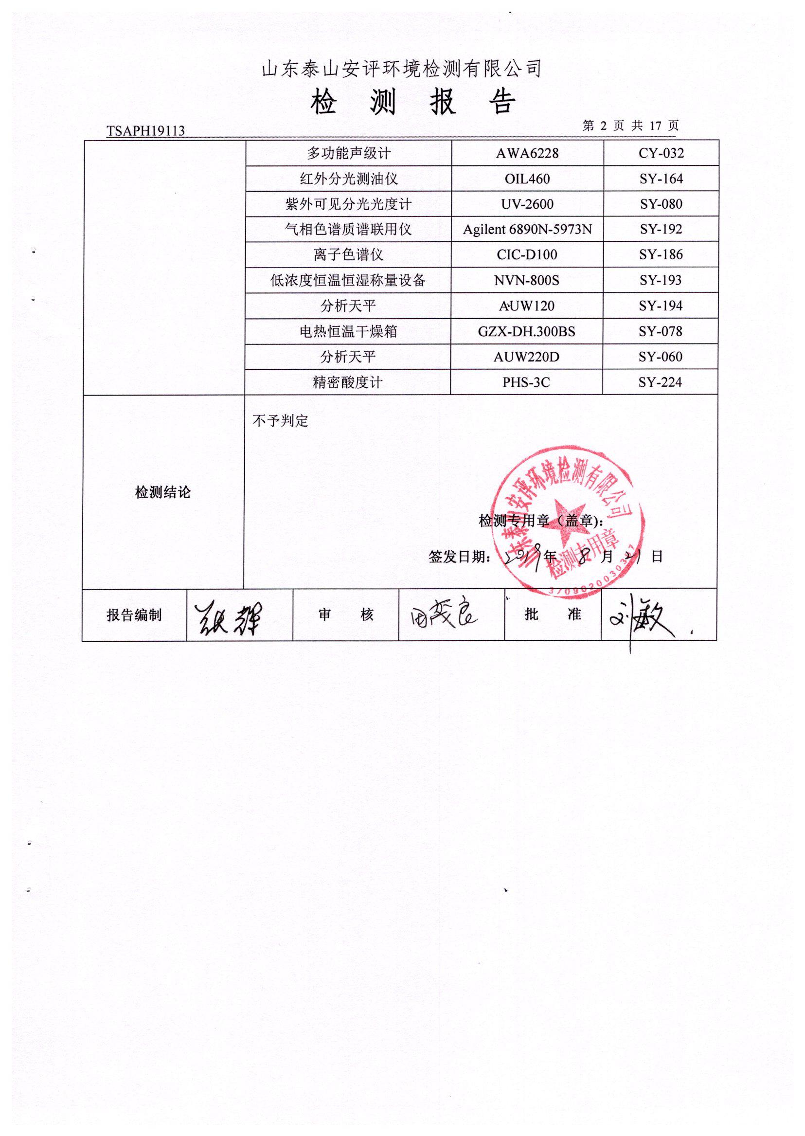 500mg/L,NH3-N 45mg/L, SS 250mg/L。實際監(jiān)測排放濃度:CODcr 96mg/L,NH3-N 0.265mg/L,SS 24mg/L。污水經(jīng)工業(yè)園區(qū)污水管網(wǎng)排往泰安嘉誠水質(zhì)凈化有限公司處理。
