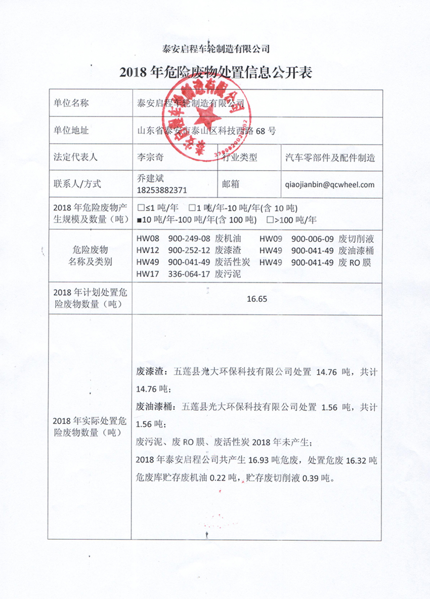 泰安啟程車輪制造有限公司危險廢物處置信息公開