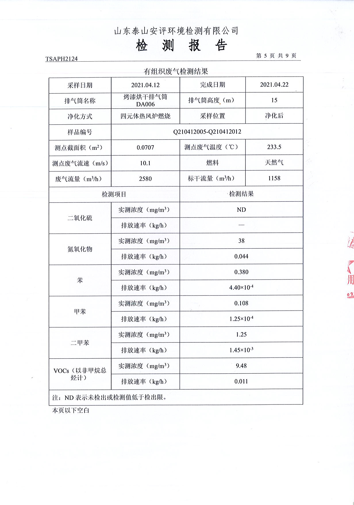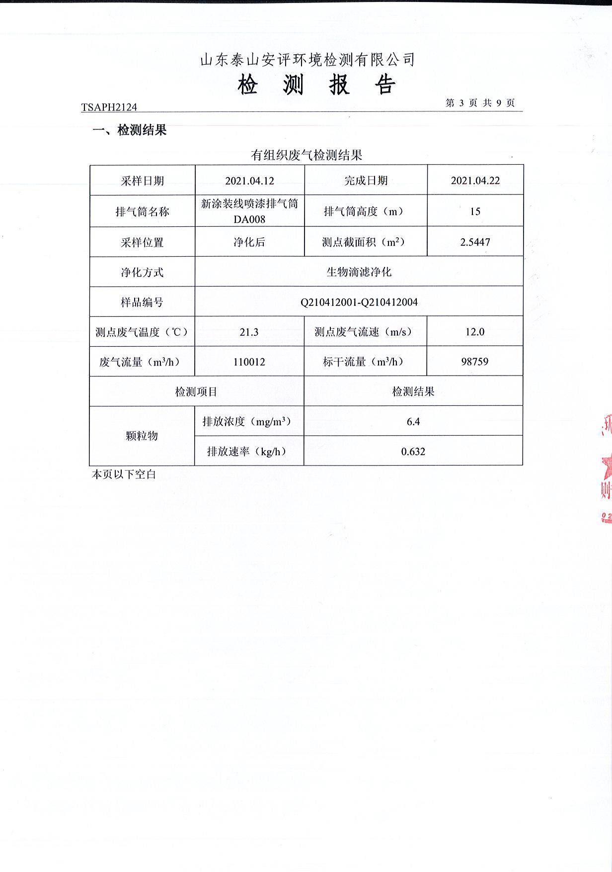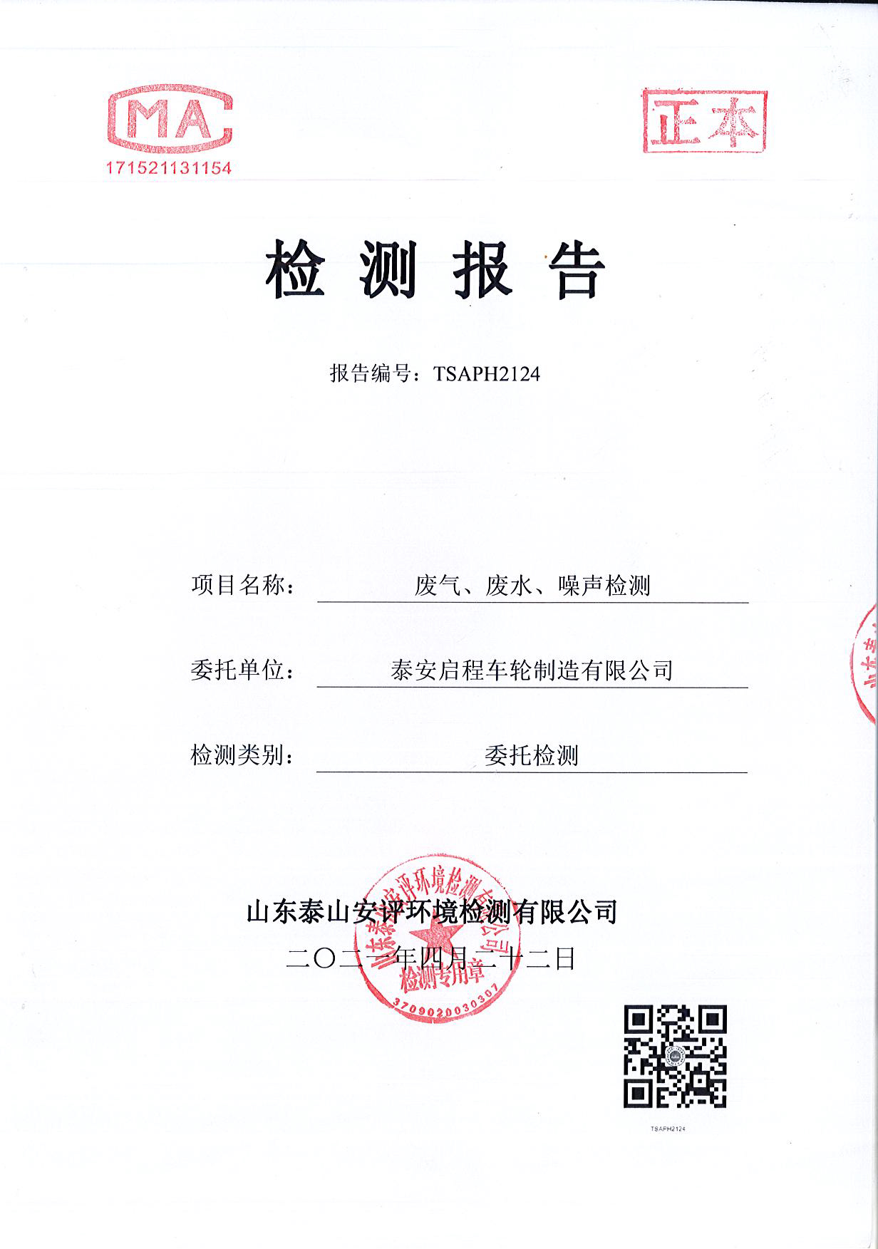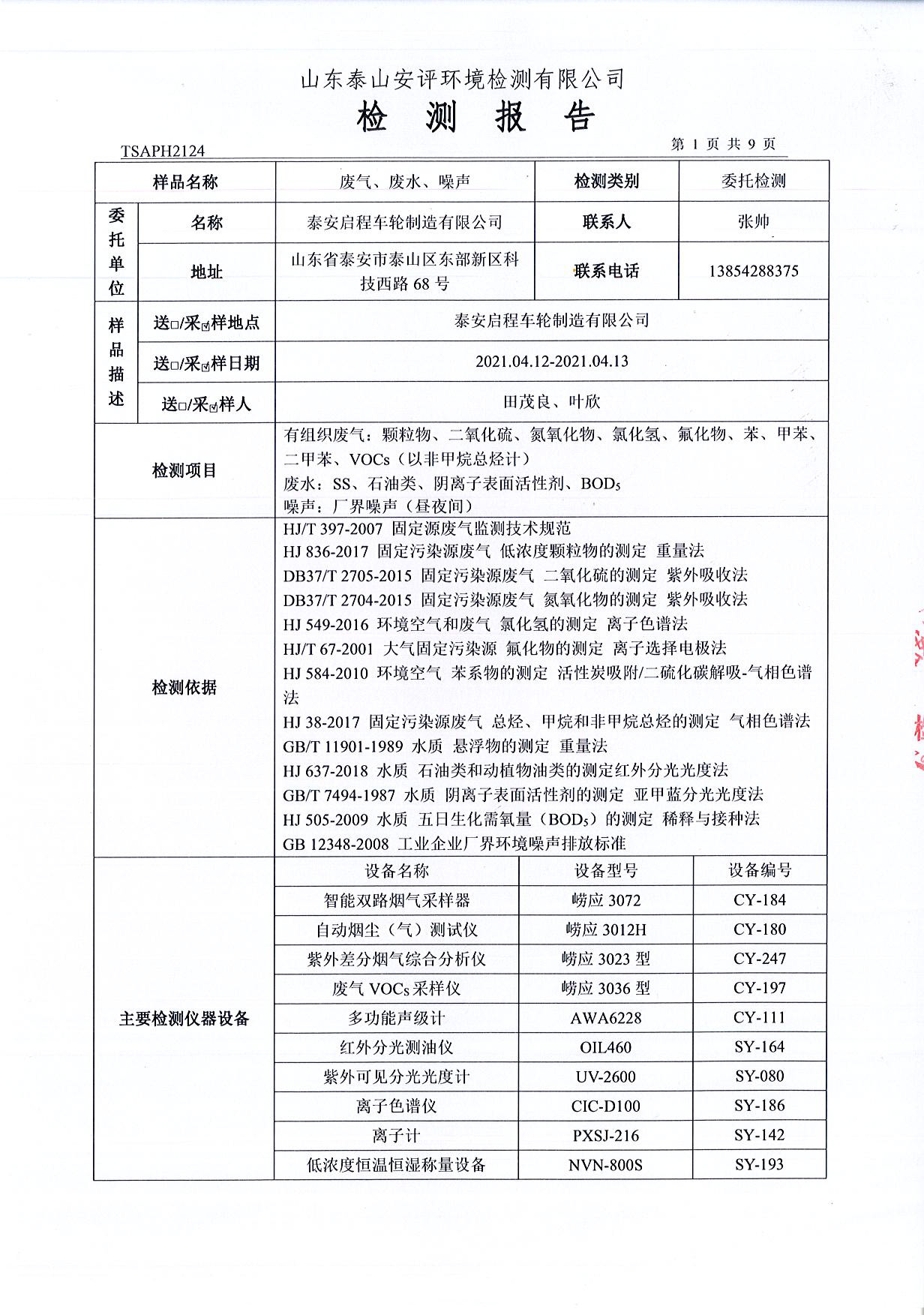 泰安啟程車輪制造有限公司2021年4月份環(huán)境污染物排放檢測報告