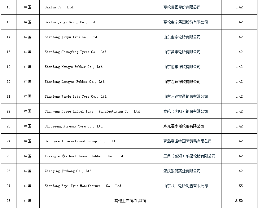附表:巴西對華客貨車輪胎第二次反傾銷日落復(fù)審終裁征稅表