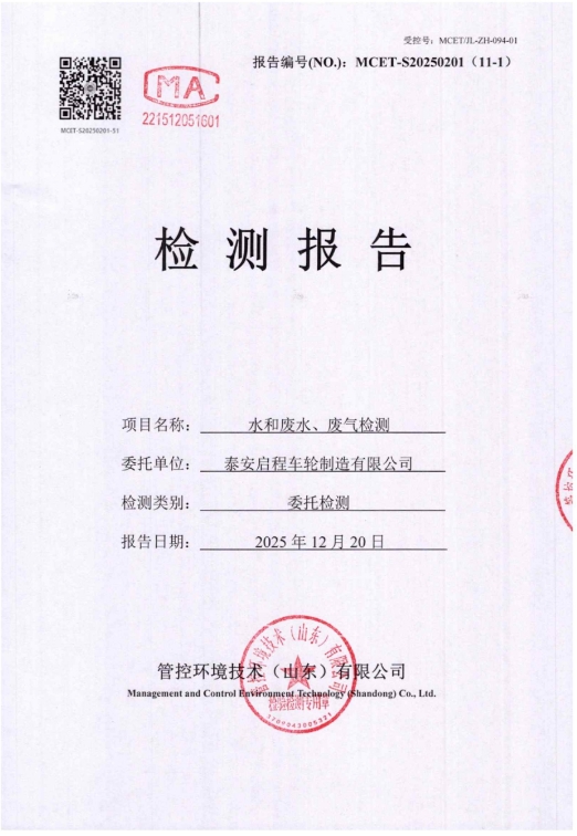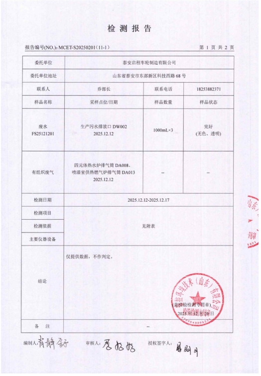 泰安啟程車輪制造有限公司2025年12月份環(huán)境污染物排放檢測報告