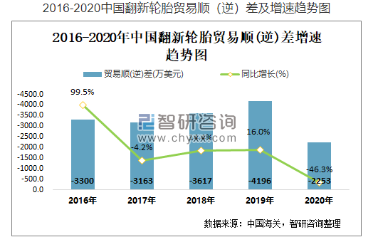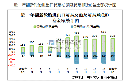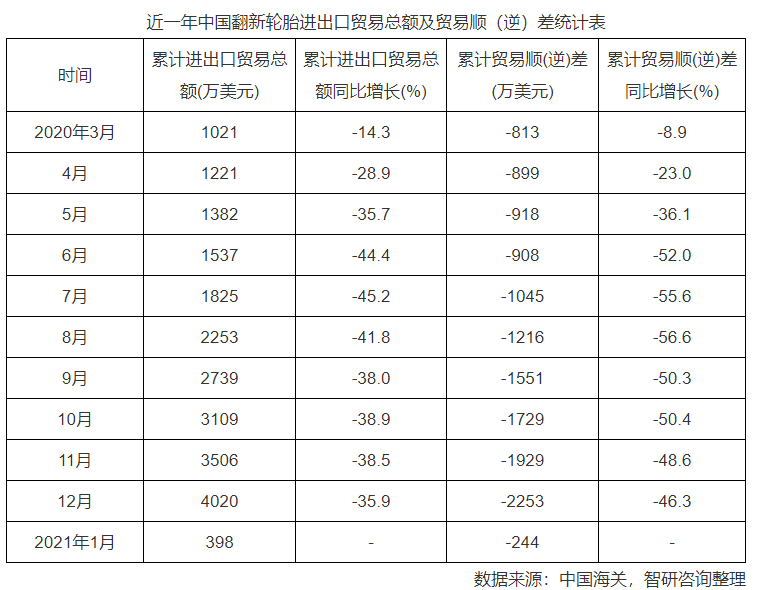 根據(jù)中國海關(guān)數(shù)據(jù)顯示:2021年1月中國翻新輪胎進(jìn)出口貿(mào)易總額為398萬美元,貿(mào)易逆差為244萬美元;2020年12月中國翻新輪胎累計進(jìn)出口貿(mào)易總額為4020萬美元,同比下降35.9%,累計貿(mào)易逆差為2253萬美元,同比下降46.3%。