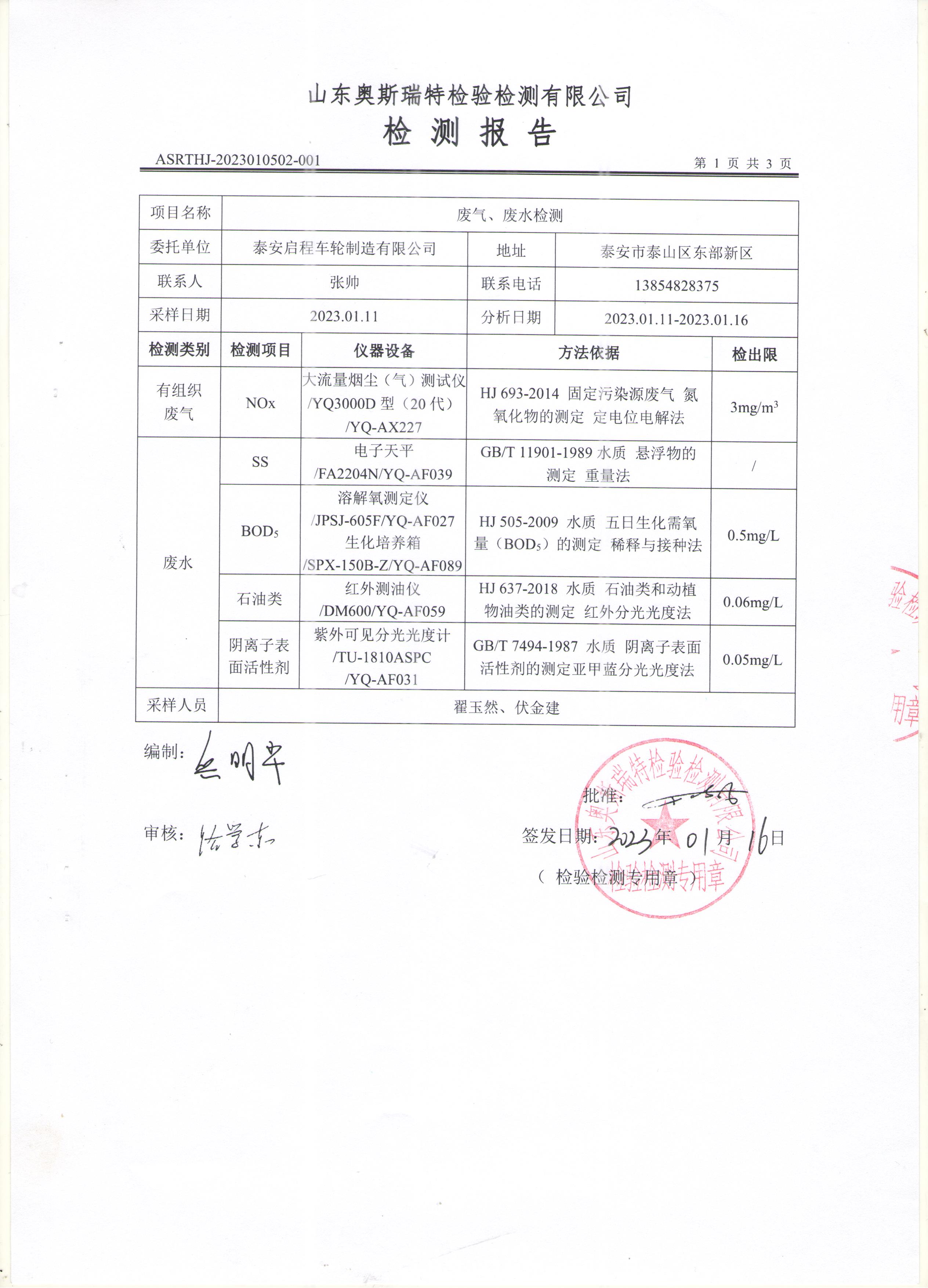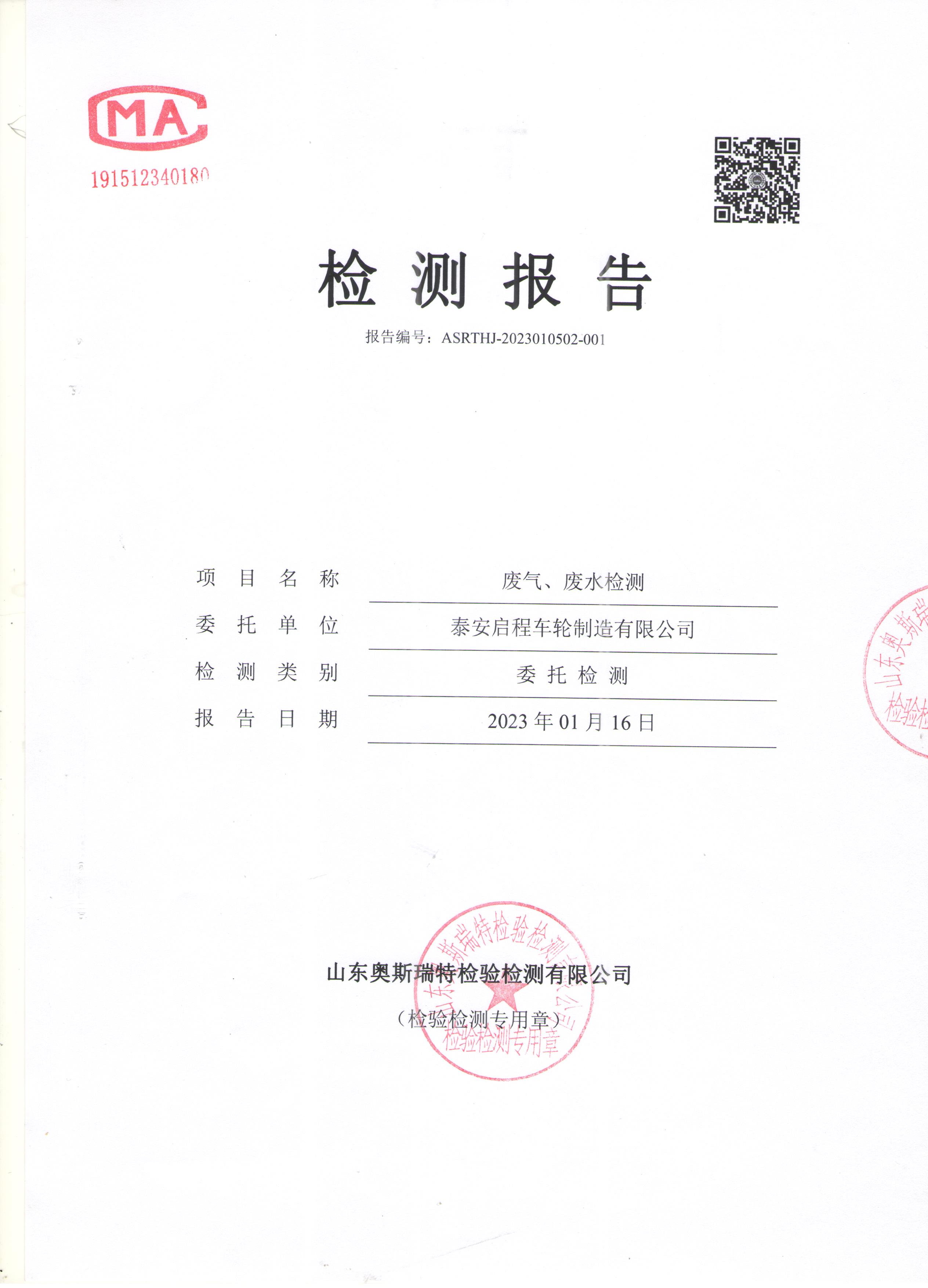 泰安啟程車輪制造有限公司2023年1月份環(huán)境污染物排放檢測(cè)報(bào)告